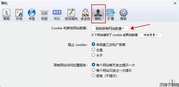 2、将打开的新窗口切换至“隐私”标签页下,之后点击“移除所有网站数据…”按钮。