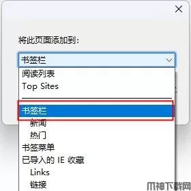 2、在弹出的新窗口中选择网页收藏的目录,比如我们选择“书签栏”,然后点击“添加”。