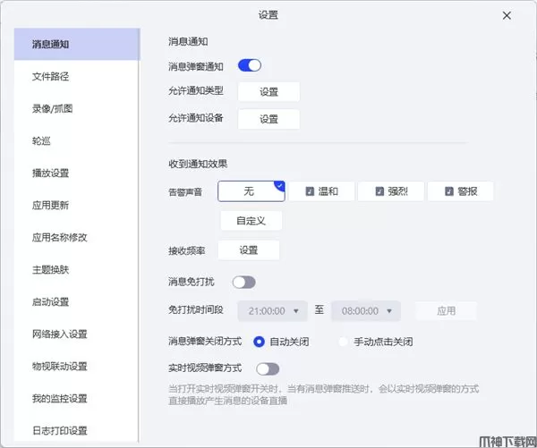 8、实时视频弹窗方式:当打开实时视频弹窗开关时,当有消息弹窗推送时,会以实时视频弹窗的方式直接播放产生消息的设备直播。