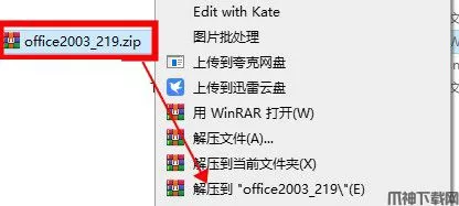 1、鼠标右击【office2003_219.zip】压缩包(win11系统需先点击“显示更多选项)选择【解压到office2003_219\(E)】。