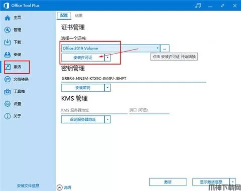 8、选择激活栏,选择一个证书“office 2019 volume”再点击安装许可证