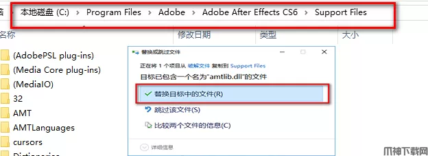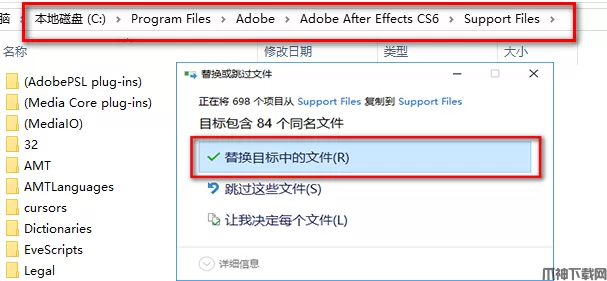 11、找到软件安装位置,默认路径为:C:ProgramFilesAdobeAdobe After Effects CCS6 Support Files,找到后,粘贴刚刚复制的文件,点击“替换目标中的文件”。