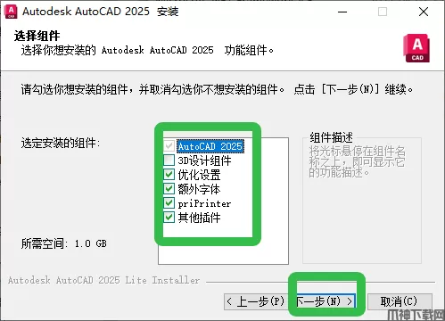 5、勾选安装组件,点击【下一步】。