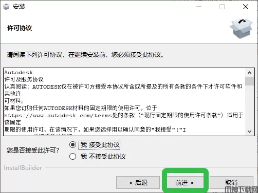 4、选择【我接受此协议】,点击【前进】。