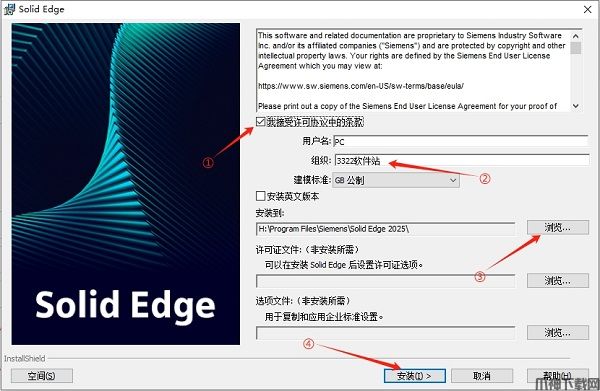2、①勾选许可协议、②输入任意组织、③更改安装路径、④点击【安装】。