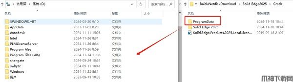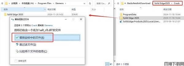 12、将【Crack】文件夹下的【Solid Edge 2025】文件夹复制到【Siemens】路径中,点击【替换目标中的文件】。