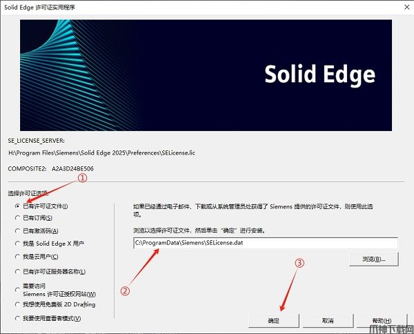 13、接着运行软件进入如下图界面:①选择【已有许可证文件】、②输入【C:\ProgramData\Siemens\SELicense.dat】、③点击【确定】。