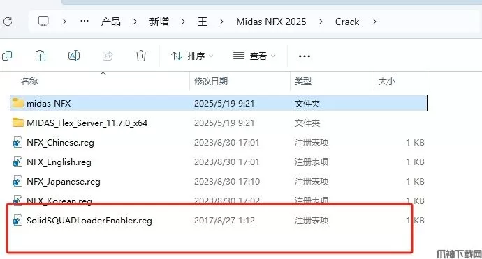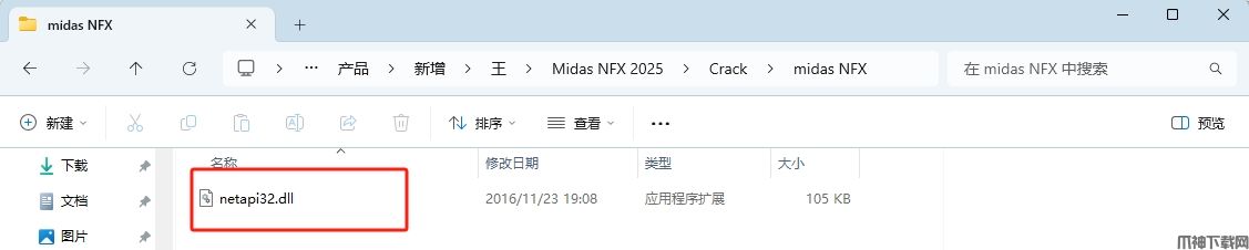 18、返回之前解压的“midas NFX 2025”文件夹,依次打开“Crack——midas NFX”文件夹,选中 ”netapi32.dll“文件夹,鼠标右键点击“复制”。
