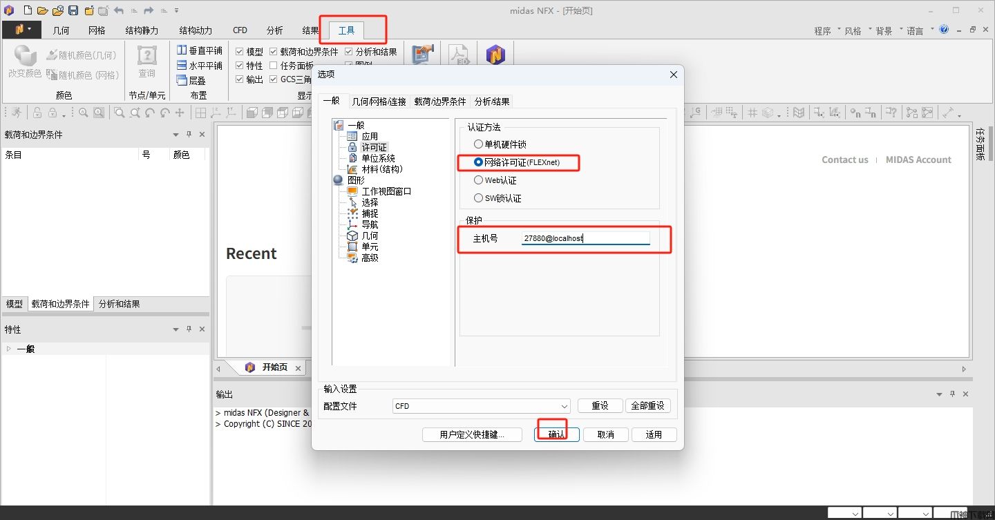24、依次点击“工具--选项--许可证--网络许可证(FLEXnet)",主机号输入:27880@localhost,点击”确认“。
