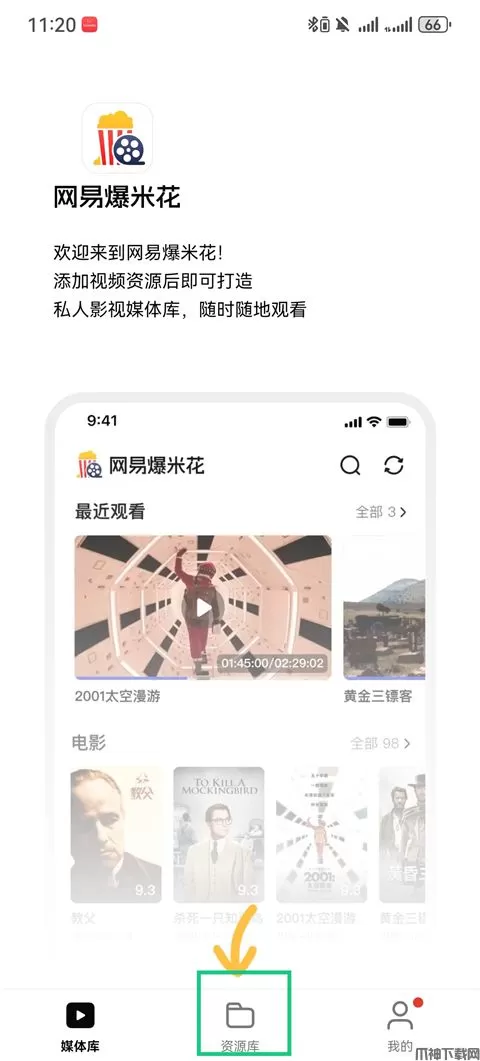 点击前往下载网易爆米花手机端,打开后,点击【资源库】。