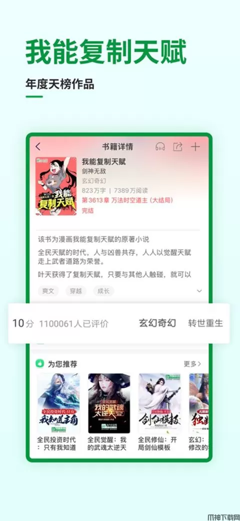 txt/epub/umd/pdf超多格式全支持;飞卢小说APP书架云端同步,多终端随心切换;图书在线缓存,离线看书省流量;智能化图书推荐,书荒找书不发愁;界面清爽操作顺,读书就是要简单。