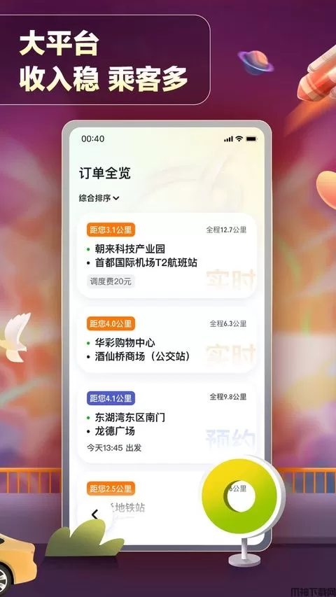 2、【丰富订单,赚钱更多】好单大单特别多,系统自动对订单进行推送,附近订单优先抢。单单高价,再不用担心空驶费用。