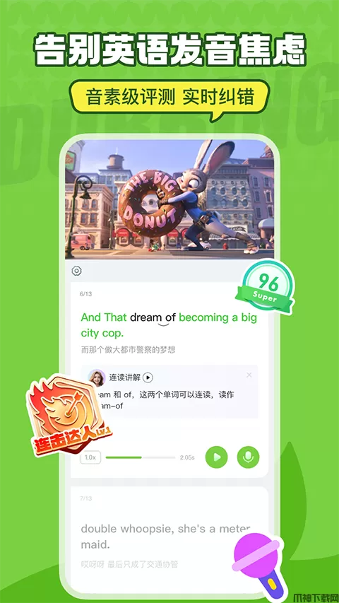英语趣配音ios版是由英语趣配音官方针对苹果ios客户端推出的一款英语配音软件。软件通过给电影配音的形式让用户练习英语口语,从此告别枯燥繁琐的背诵英语,让你一边看电影一边快速学习英语。英语趣配音ios版的素材丰富,汇集了目前最火爆的国际电影大片、英文歌曲、英美剧、视频配音素材等等,支持离线配音、离线合成,生词翻译等功能,让你随时随地玩转配音。这里还有诸多爱好英语的男神女神、配音达人,你可以时刻关注他们的最新动态,与他们聊天互动,发现你的兴趣圈子。此外,软件还支持一键分享功能,你可以将你的作品通过QQ、微信、朋友圈分享给其他好友,号召小伙伴一起加入配音。