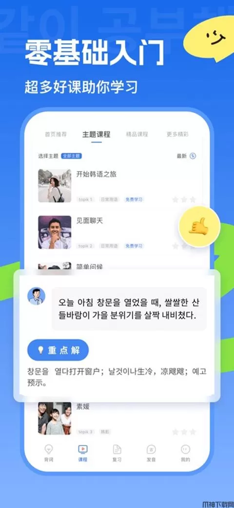 精编吃吃喝喝、人际交往等专题课程,更有热门综艺《RunningMan》、《拜托了 冰箱》.... .经典韩剧《来自星星的你》、《请回答1988》...词、句到对话学习,循序渐进,闯关形式使学习更有动力。