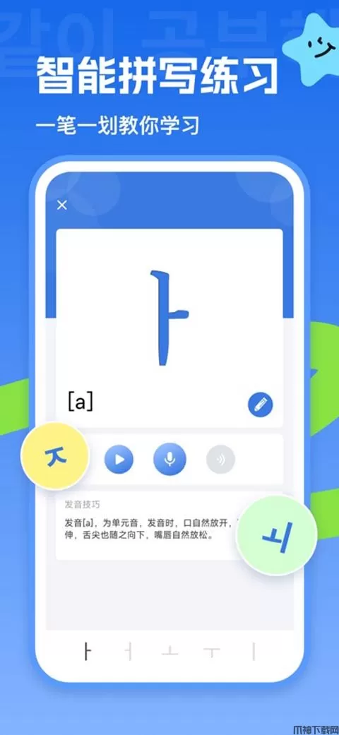 标准的21个元音,19个辅音,地道首尔口音音频教学,详细的发音技巧,还能跟读录音哦。