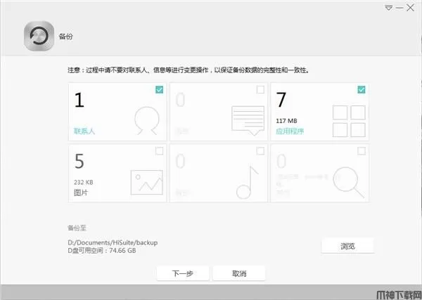 5、在HiSuite刷机升级之前软件会要求备份手机中的个人资料,如果已经备份过的话可以直接跳过该步骤,继续下一步操作。