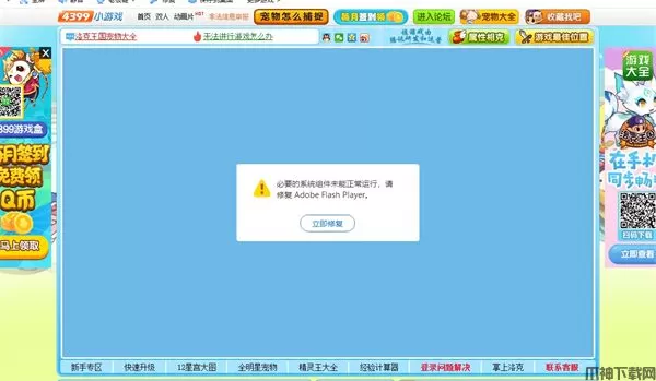以大家熟知的IE浏览量举例,该款浏览器并不支持已经被淘汰的Adobe Flash Player插件,即使前往官网下载也无法使用,此时我们用IE浏览器访问经典Flash游戏洛克王国可以看到是明显打不开的,游戏界面直接是白屏,并且会提示此页面上的内容需要Flash。