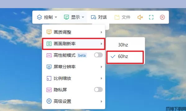 1、在主控端发起远程连接,在工具栏里选择 “显示”->“画质调整”->“超清/原画”: