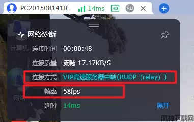 3、检查左上角的连接方式(RUDP relay或RUDP P2P)和帧率:
