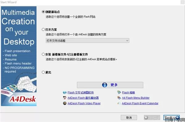2、初次进入程序后,会自动弹出一个创建向导。非常的人性化。首先我们可以创建新站点或打开一个已有的方案进行修改。当然也可以安装已注册的模板。