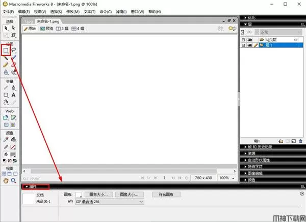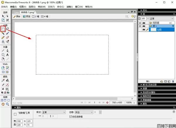 3、选择绘图工具栏中的【选取框】工具,在【属性】面板中进行相应的设置,
