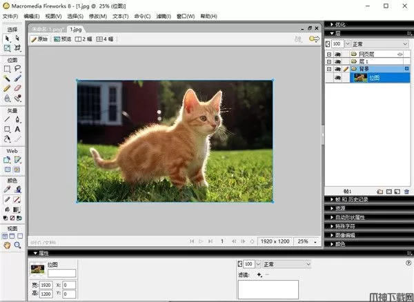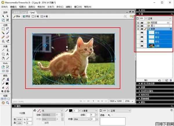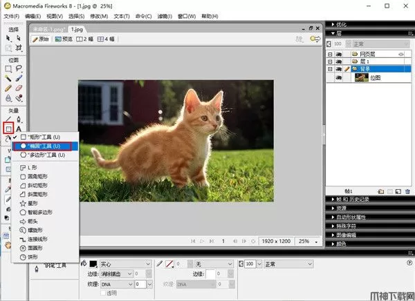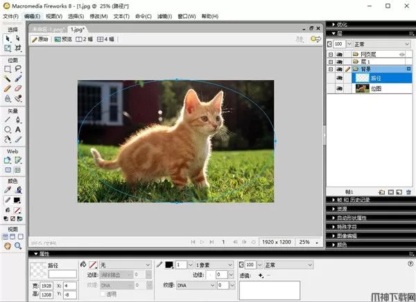 7、在Fireworks 8的新窗口中打开事先准备好的图像素材“.jpg”,选择绘图工具栏中的【椭圆选取框】工具,在【属性】面板中进行相应的设置。
