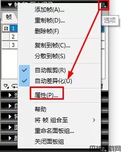 7、设置每一帧的显示时间。选中帧之后,右上角有一个小图标,滑动时候会显示“选项”,单击小图标,选择“属性”,就可以设置时间了。