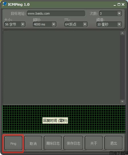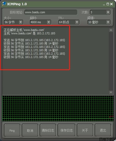 4、在ICMPing的可视化界面中即会显示用户想Ping的目标地址的相关网速状态。如果这个time时间后面的10ms(毫秒)等数字越小说明网速越快,反之越慢,如果出现“”说明超时,网络是不通的,哪果是内网请检查网线是不是掉了,外网的话请查看是不是路由或网站原因
