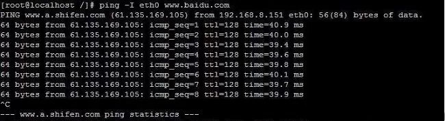 2、ping -I eth0 www.baidu.com 或 ping -I 192.168.8.151 www.baidu.com,即 -I 选项可以指定发送ping包的网卡,-I后接网卡名或者网卡的IP地址都是可以的