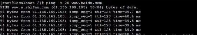 4、ping -t 20 www.baidu.com,-t 选项可以设置承载ICMP报文的IP数据包的TTL值