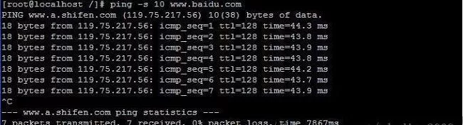 5、ping -s 10 www.baidu.com,-s 选项可以设置ICMP数据部分的大小,可以看到数据部分10个字节,加上8字节的ICMP头,则ICMP包大小为18字节,再加上20字节的IP头,IP包大小为38字节