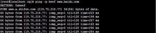 6、ping -p beef www.baidu.com,-p 选项可以设置icmp报文数据部分的内容,后跟的 beef 即为16进制的填充数据,后面跟的数据最大可为16个字节