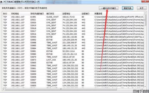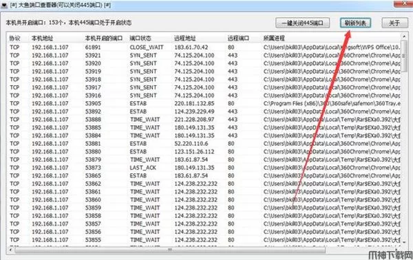 大鱼端口查看器是一款可以查看计算机开放端口和一键关闭445端口的软件。大鱼端口查看器可以轻轻松松查看您的计算机开放端口列表,并帮您找到且关闭您电脑的445端口,有效预防勒索病毒入侵,有需要的小伙伴们,赶紧来下载使用吧!