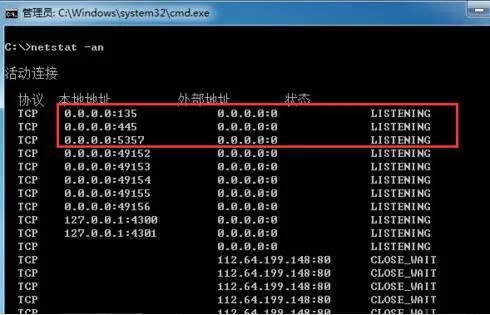 2)接着,可以发现当前系统开放了135、445以及5357端口,而且从状态看都处于监听状态“Listening”。