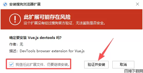 3、将需要安装的插件拖到浏览器内,勾选【我信任此扩展文件】,点击【验证并安装】。