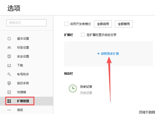 2、选择【扩展管理】,点击【获取更多扩展】。