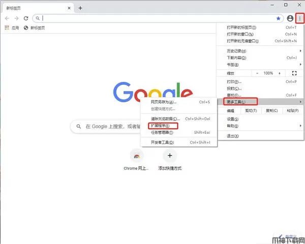 1、首先用户点击谷歌浏览器右上角的自定义及控制按钮,在下拉框中选择工具选项,然后点击扩展程序来启动Chrome浏览器的扩展管理器页面