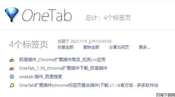 OneTab插件是一款功能强大的浏览器插件工具,通常我们在浏览器里打开多个页面的时候都会觉得很乱,所以就能够使用该插件对当前打开的标签页进行保存,当用户有需要的时候还可以通过插件再次打开之前的标签页。