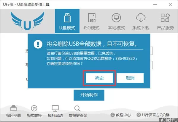 2、此时会弹出一个警告窗口,告知用户 “制作前请务必做好数据备份,否则将会丢失”,请确认u盘中数据是否另行备份,确认完成后直接点击 “确定” 按钮,如下图所示: