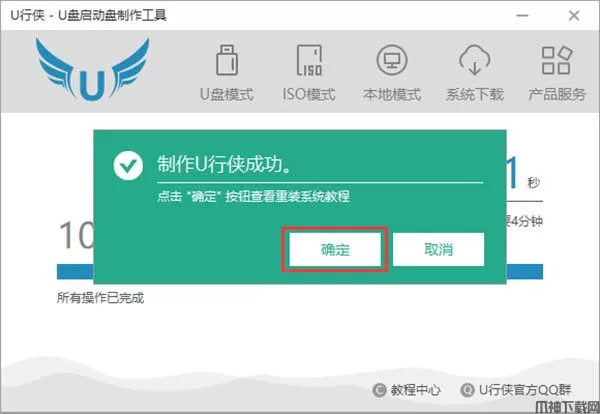4、制作成功后会弹出一个窗口,告知用户 “制作U行侠成功”,此时点击 “确定” 按钮,可以测试U盘启动的启动情况,如下图所示: