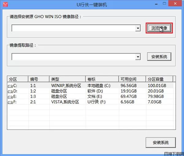 4、进入U行侠PE系统后,U行侠一键装机工具会自动启动,之后我们点击 “浏览镜像” 按钮,如下图所示: