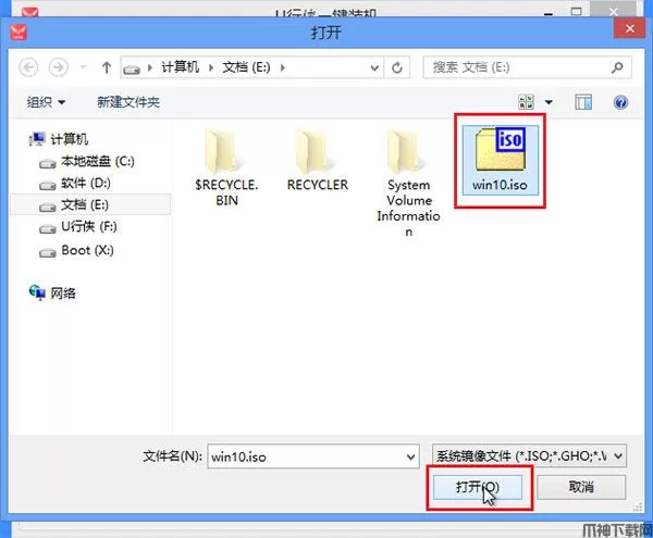5、在弹出的选择文件对话框里,选择已经下载准备好的原版Win10系统镜像,之后我们点击 “打开” 按钮选择原版Win10系统镜像,如下图所示: