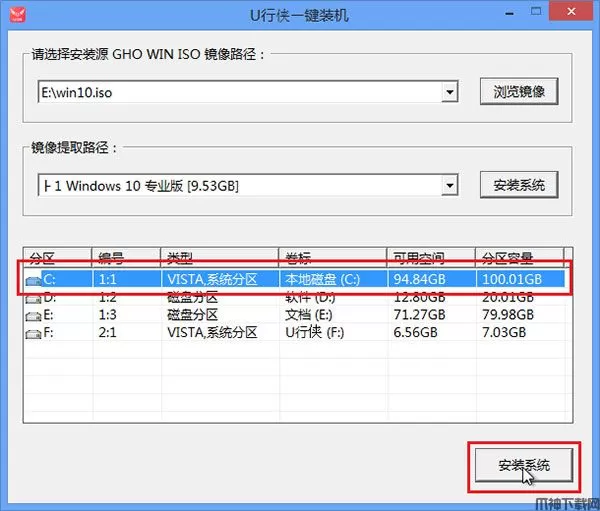 6、选择好原版Win10系统镜像后,选择要安装的盘符(一般是C盘),之后我们点击 “安装系统” 按钮开始安装原版Win10系统,如下图所示: