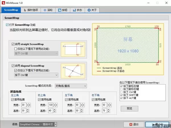 2、ScreenWrap功能:当鼠标光标到达屏幕边缘时,它将沿着垂直或对角线自动移动到相对边缘。
