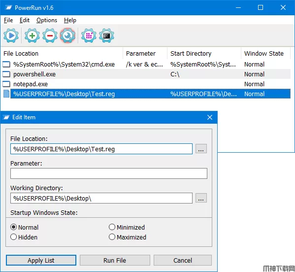 复制所需的注册表项并单击“打开”按钮,PowerRun将打开regedit(具有最高权限)并自动跳转到该键。如果你想添加任何参数,以列出的脚本或程序右键单击它,并使用“编辑项目”或只是使用扳手按钮