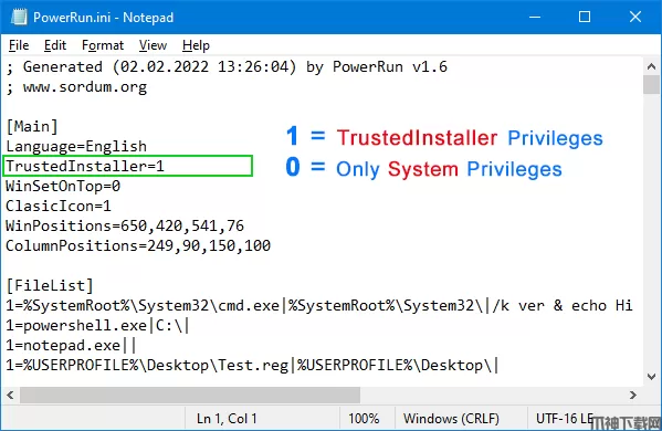 你可以使用PowerRun.exe只有系统权限,做到这一点;请用文本编辑器打开PowerRun.ini,将TrustedInstaller=1的值从1改为0。