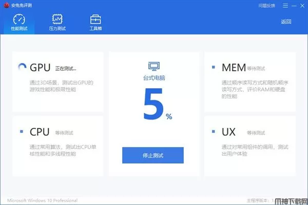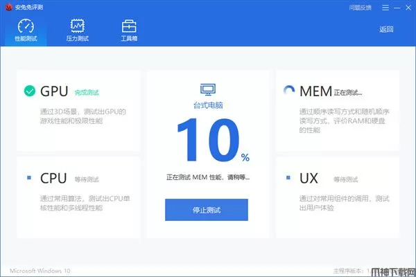4、与其它版本一样,安兔兔评测Windows版共提供了四大测试项目,分别为CPU、GPU、MEM和UX。