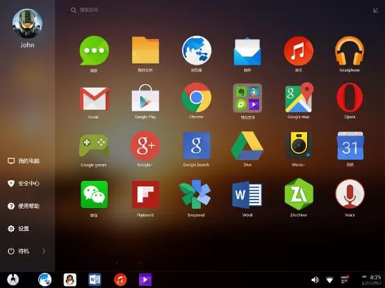3、经典的"开始",凤凰系统采用了开始菜单作为系统的综合入口,你可以启动已安装的应用,也可以进入系统设置等功能。如果你喜欢,你还可以将开始菜单全屏化,一次浏览更多的应用。
