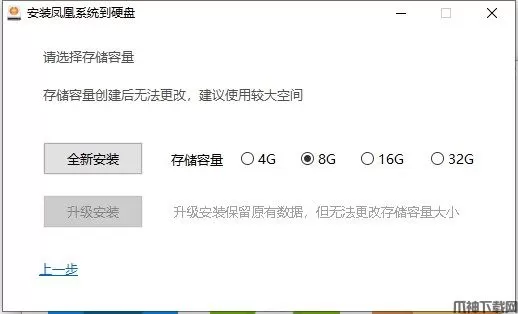 5、接下来是选择安装大小,凤凰系统支持4个大小:4G、8G、16G、32G;对应安装后凤凰系统容量大小。体积越大, 功能越全面小伙伴们根据自己的实际需求进行选择,选择完成后,点击“全新安装”按钮,开始安装系统