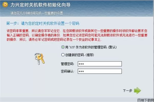 4、输入原始密码然后两次输入新密码便可成功地修改力兴定时关机软件的管理密码。